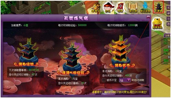 1. 优化天焚练气塔界面,新增使用元宝领取钱币的功能,并取消商城银票售卖,提高了元宝购买银票的性价比。