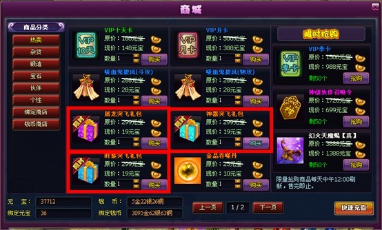 商城限时热卖将以超值优惠价出售【屠龙突飞礼包】、【神器突飞礼包】、【时装突飞大礼包】,限时出售,不要错过机会喔!
