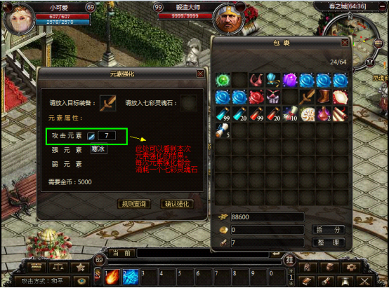 1. 在锻造师处可以进行装备的元素强化,华景村的(99,32)和春之城的(66,38)处各有一个锻造师。