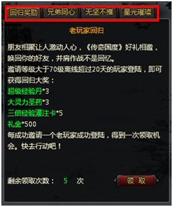 在这个面板可以对离线超过20天等级大于70好友进行发起邀请,当对方验证后,可以领取大量超值道具,邀请越多领取次数越多